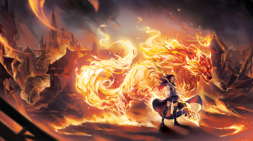 Fully rendered half or fullbody characters with complex backgrounds and other elements.